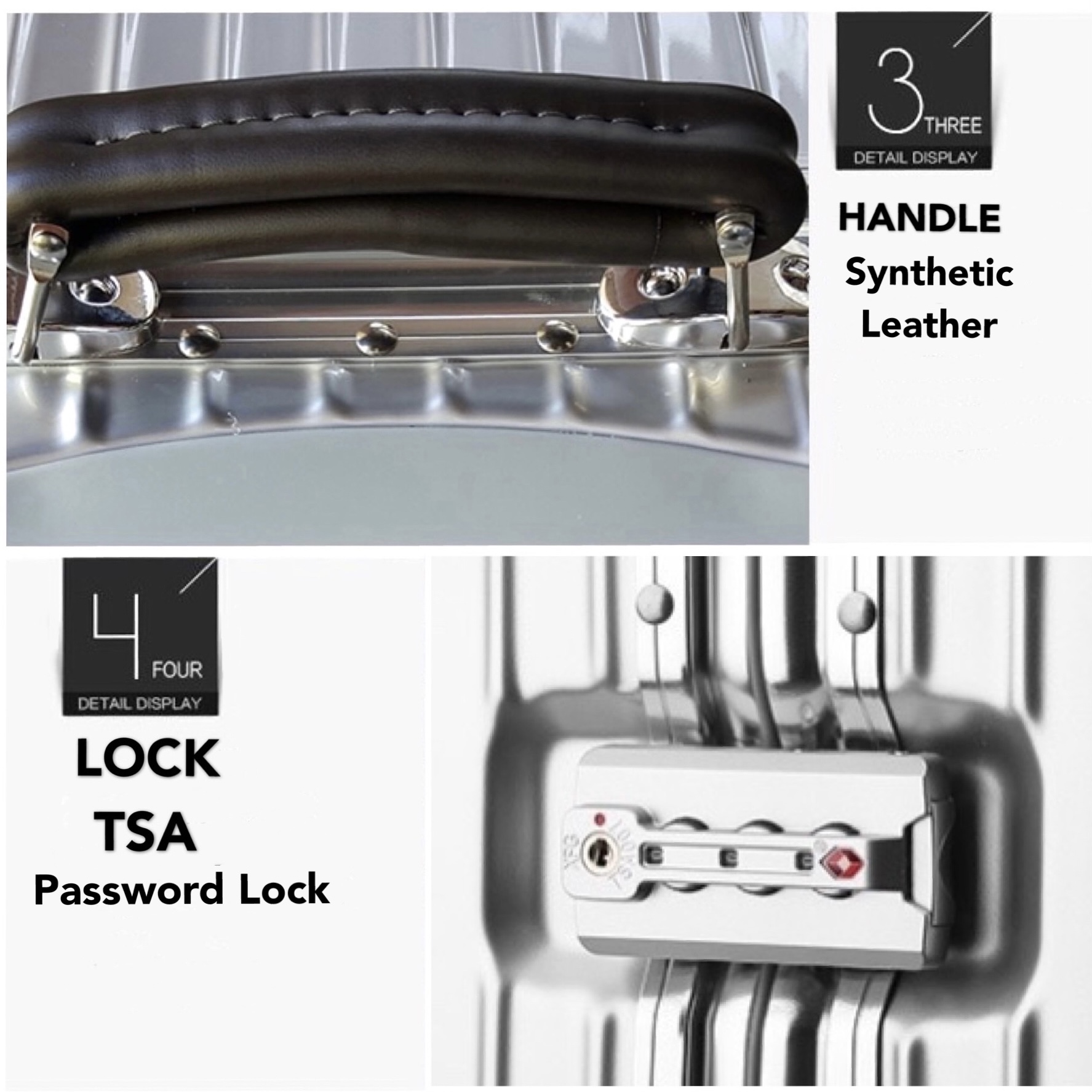*Brand: No Brand *Texture: ABS+PC *Lock: TSA Password Lock *Wheel: Universal Wheel 360 Rotation *Pull Rod: Multi-Position Adjustment Shake Within 1CM *Handle: Synthetic Leather *Lining Material: Polyester *Internal: Zipper Pocket Cell Phone Pocket *Size: 20 inch-54*37*23CM 29 inch-76*51*29CM *Weight: 20 inch-4kg 29 inch-6kg *May Change of Mind,7 Days Return to Seller *Warranty 3 Months