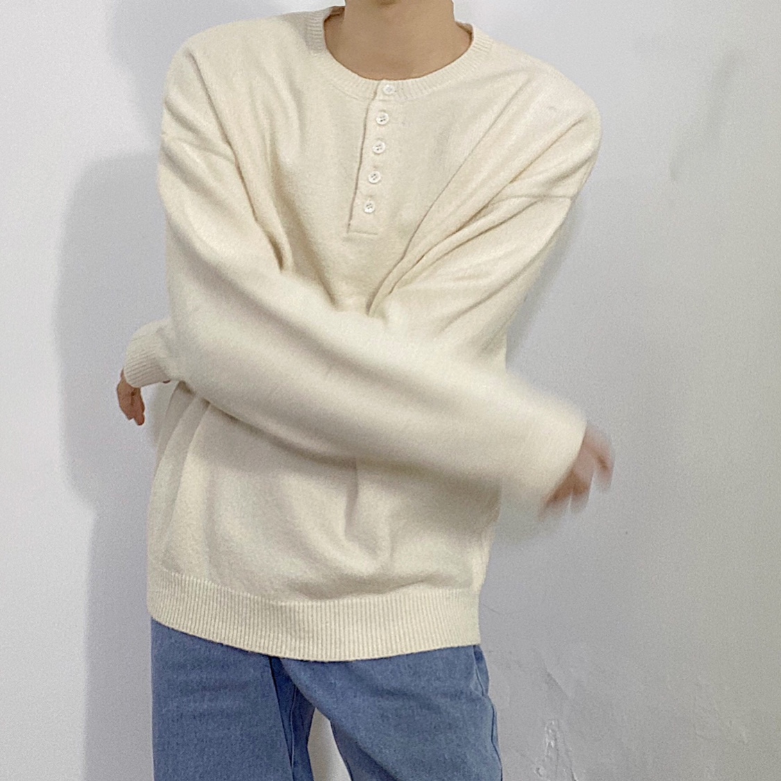 Korean Style Loose Design Open Collar Placket Buckle Lazy Sweater Ins Solid Color round Neck Pullover Knitted Sweater Men