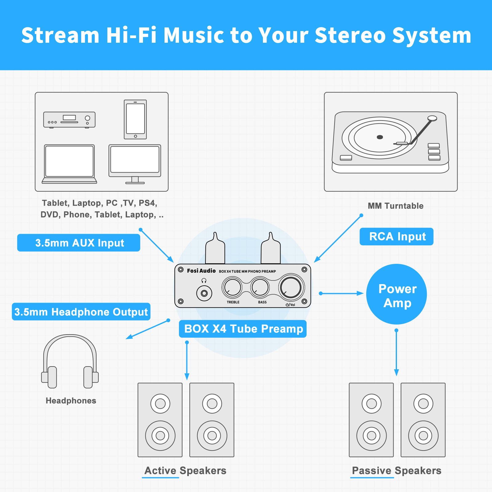 Fosi Audio BOX X4 is a Hifi tube phono preamp and headphone amplifier for MM turntable that features Volume control and Bass/Treble control with DC 12V power supply. The BOX X4 supports MM turntable input, 3.5mm AUX input and 3.5mm headphone output and RCA line output for powered speakers or amplifiers for your home audio system. Compact ultra-low noise phono turntable preamp that converts phono signals to line level signals. The BOX X4 equipping with 5654W vacuum tubes stands up to the test and will provide you with serious sound performance.
