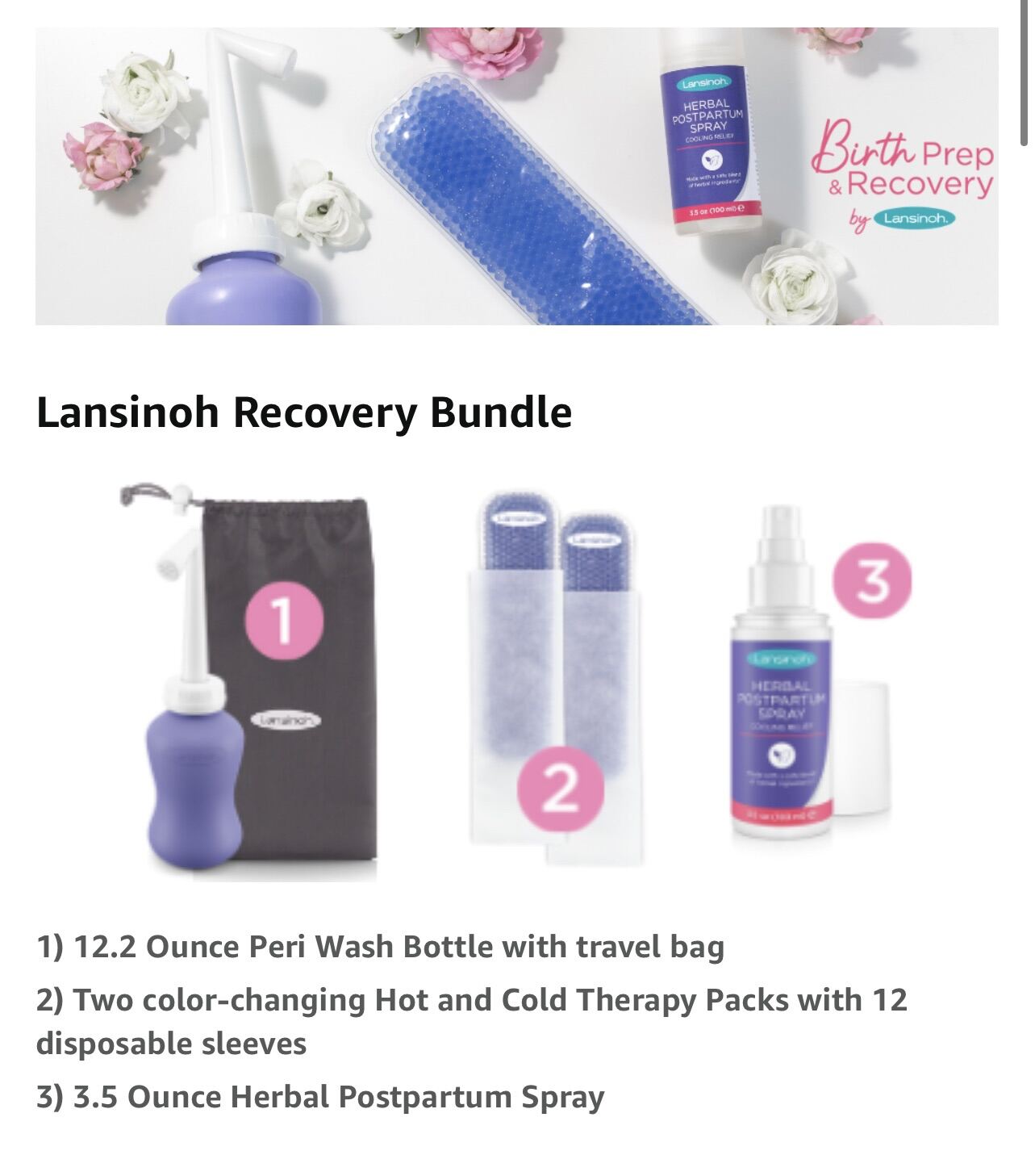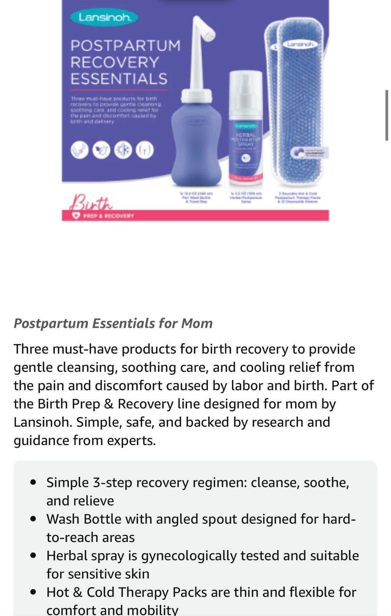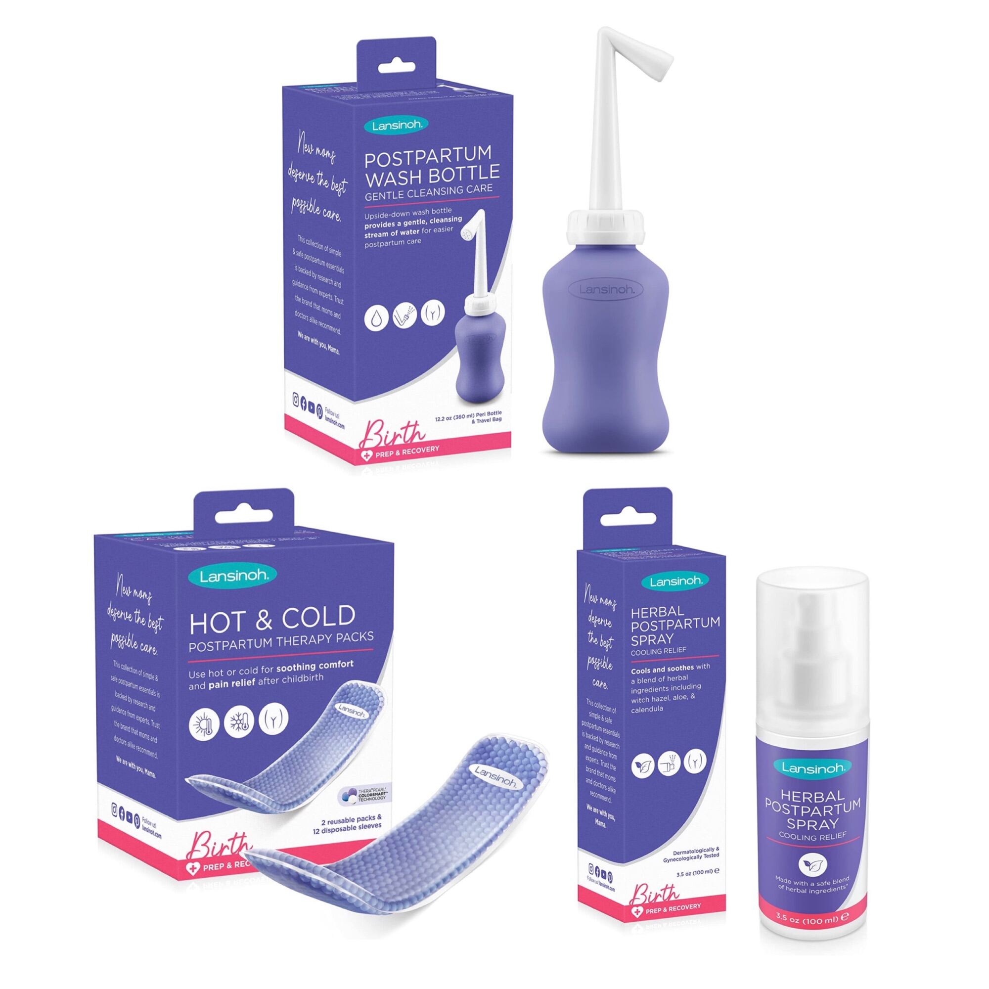Three must-have products for birth recovery to provide gentle cleansing, soothing care, and cooling relief from the pain and discomfort caused by labor and birth. Part of the Birth Prep & Recovery line designed for mom by Lansinoh. Simple, safe, and    backed by research and guidance from experts.