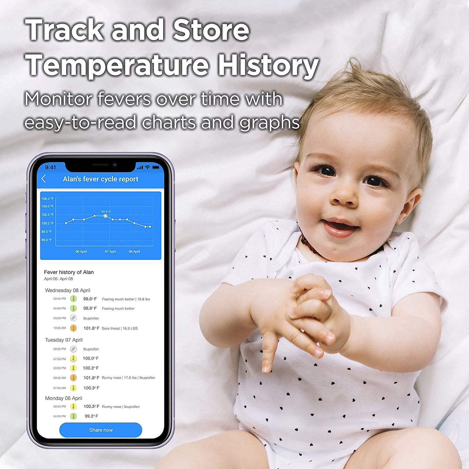 • Keep a close watch on your baby’s body temperature and easily monitor the course of the fever. Track and store temperature history on your smart device, and monitor fever readings with easy-to-read charts and graphs.