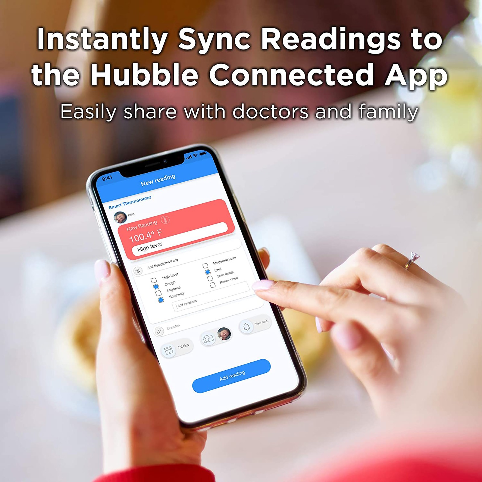 • Download the Hubble Connected app on your smartphone and access a variety of useful features. The app allows you to easily log medications, symptoms, and health notes. It also helps you set prompt reminders and alarms for doctor appointments and administering medicine.