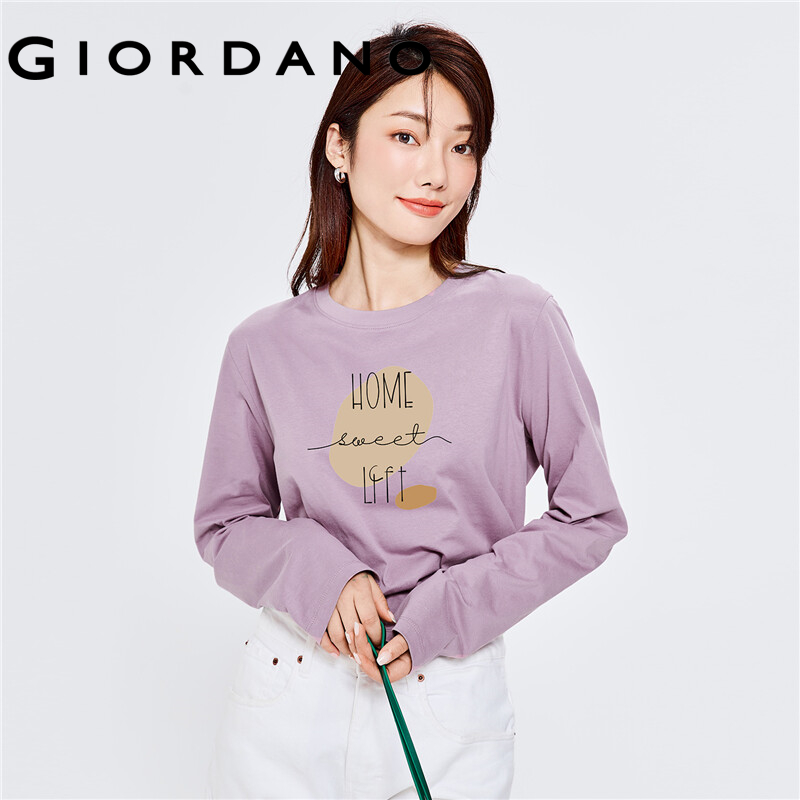 GIORDANO Women Huaxiansheng Series T-Shirts Long Sleeve 100% Cotton Simple Tee Crewneck Print Comfy Casual T-Shirts 99392189