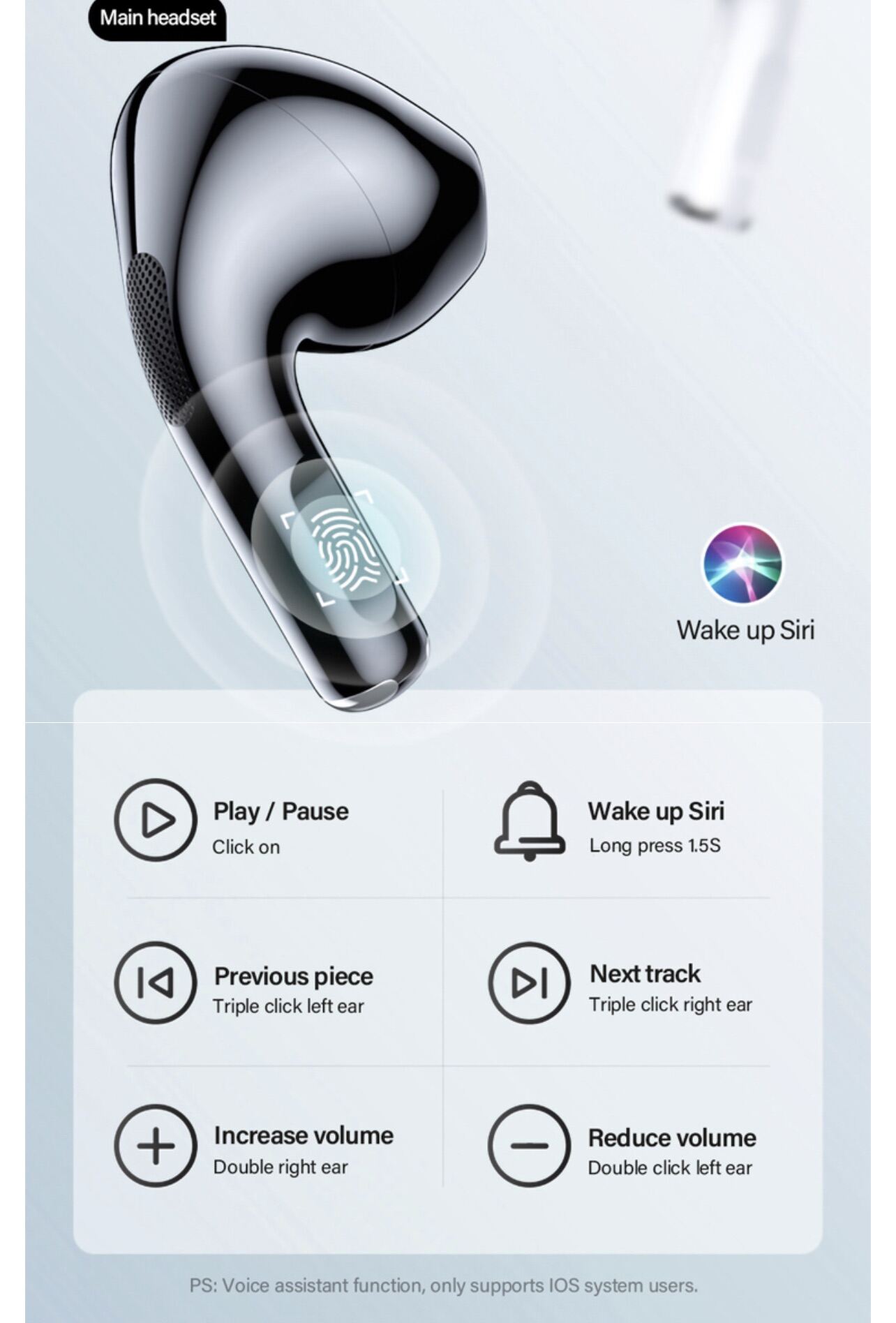 - Touch control design, no more pressure on your ears. Bluetooth Earbuds Easy to control music and calls, and to activate voice assistant. The curved surface of the earphones will also gently fit in your ears.