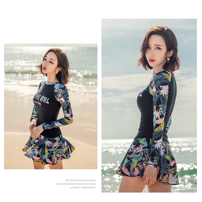 Luoke Letter Floral Print Women Fashion Long Sleeve Two Pieces Suits Sun-resistant Swimsuit swimming suit