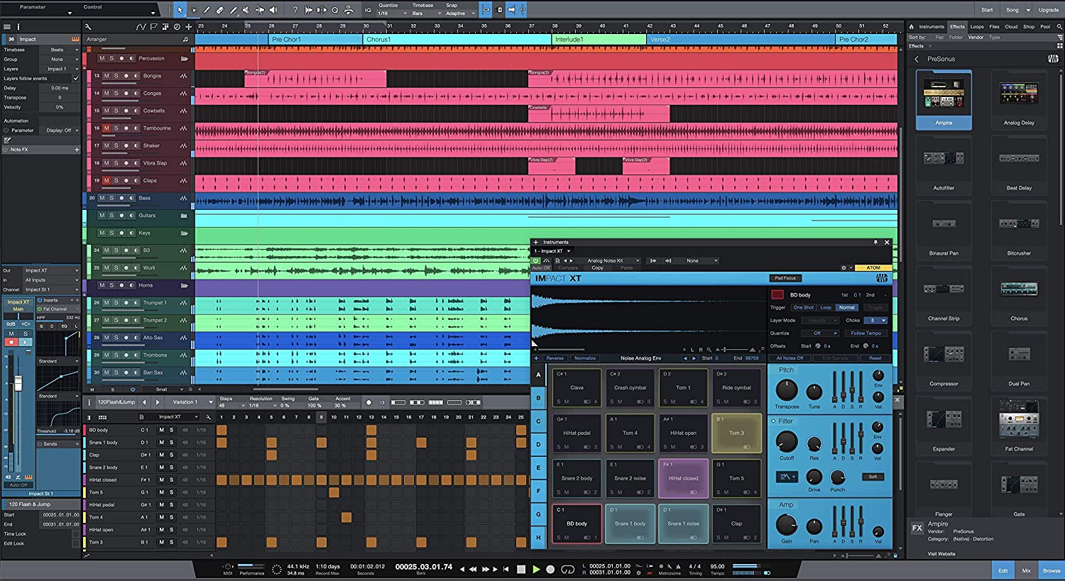 Five powerful virtual instruments including: . ○ Impact XT: powerful multi-channel drum sampler for beats and loops. ○ Presence XT: virtual sample-player instrument (14 GB library included). ○ Mai Tai: polyphonic analog modeling synthesizer . ○ Mojito: monophonic subtractive synthesizer ideal for basslines and leads. ○ Sample One XT: robust sampler and sample editor